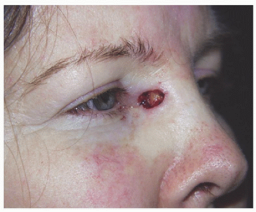 ![]() Figure 2.1B. Superficial defect on the right medial canthus measures approximately 1.1 × 0.7 cm. Patient wanted to avoid additional scars and desired simplest repair. |