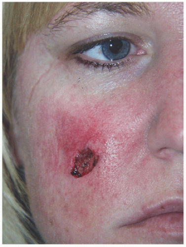 Second intention healing may be an excellent alternative for select defects. For surgical defects on concave areas, repair by second intention healing offers a simple and attractive repair option (Fig. 2.1A). Large defects on the concave surface of the temple heal well by second intention healing so long as the defect is not too close to a free margin or anatomical landmark (Section 4.8). In these situations, where the defect may be close to the eyebrow, lateral canthus, or eyelid, a graft or partial closure repair near the free margin may be used to minimize scar contracture and avoid free margin or anatomical landmark deviation (Section 8.6).