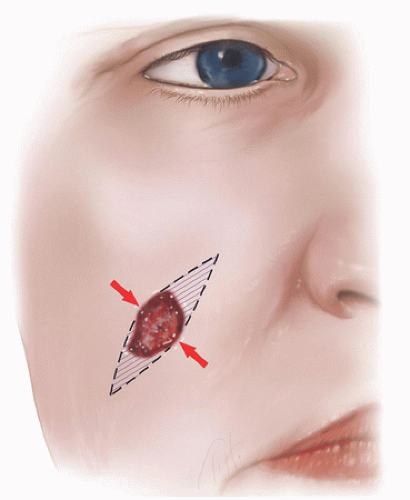 Through closure of the defect and removal of the dog ears, the final length of the incision and scar is lengthened. In general, the length of the closure (i.e., the length of an elliptical excision) is roughly three times the width of the closure (i.e., the width of the ellipse); however, this ratio can be increased to 4:1 or greater when the closure is over a convex surface (e.g., convex portion of the cheek or around the forearm) (Section 3.1). A key point is to discuss and explain this to the patient in advance of the repair. Most people understand and appreciate the concept of lengthening the repair, removing the dog ears, placement within RSTL, especially when explained in advance of the repair. Better to educate in advance rather than try to justify later.