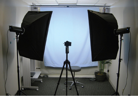 Fig. 29.1 Photography studio with dual light sources, soft boxes, tripod, and background material. Not all clinics have the space for such a setup.