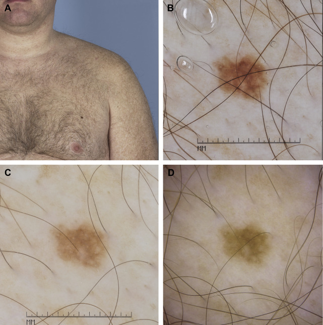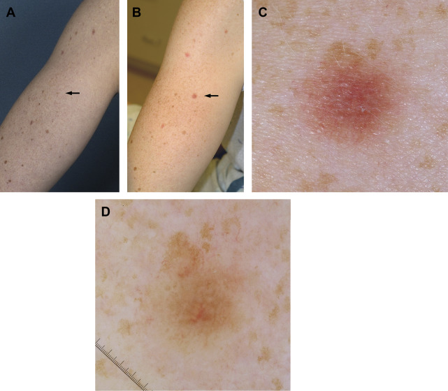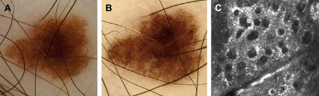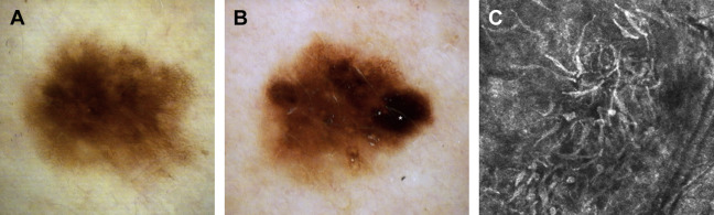 Nevi and melanomas can display similar morphologic changes during dermoscopic monitoring and may even grow at similar rates. Indeed, studies have demonstrated that nevi and melanomas removed during SDDI are often clinically and dermoscopically indistinguishable and that change alone permitted melanoma identification. However, the most relevant changes associated with melanoma during SDDI are asymmetric enlargement, appearance of focal or eccentric new structures (ie, “dermoscopic island”), or the appearance of atypical focal dermoscopic features such as vessels or regression features. Changing lesions with features concerning for melanoma should undergo biopsy, whereas lesions with equivocal features can undergo RCM or repeated dermoscopic imaging over a longer or sometimes indefinite time interval ( Fig. 5 ).