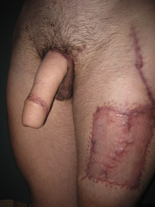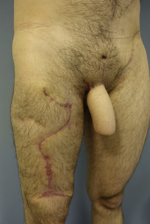 There is a particular subset of patients who want to avoid both scars because, although the thigh scars can be easily concealed whit a pair of shorts while dressed, they cannot be concealed when naked and are very close to the genital area. These patients would rather avoid disfigurement of the area that is the center of their masculinity and intimacy. Pre-expansion of the ALT allows donor site scarring to be minimized in these patients ( Fig. 3 ).