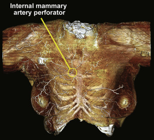The perforating branches of the IMA pass through the intercostal muscles and medial pectoralis major. These cutaneous perforating branches are given off by the IMA in the first 5 to 6 intercostal spaces. The second perforator is generally the largest (usually >0.8 mm). In an anatomic study conducted by Wong and colleagues, the mean perforator diameter among IMA perforators was 1.50 mm in the first intercostal space, 1.83 mm in the second intercostal space, and 1.47 mm in the third intercostal space. The IMAPs have been demonstrated to vary in size and dominance between patients and chest side. The IMAP flap is based on a single or double perforator of the IMA, and it can generally extend from the midline of the chest to the anterior axillary line.