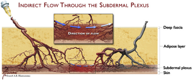Direct and indirect linking vessels ( Fig. 2 ). Direct linking vessels are large vessels that communicate directly from one perforator to the next, and indirect linking vessels maintain perfusion between perforators through recurrent flow from the subdermal plexus.