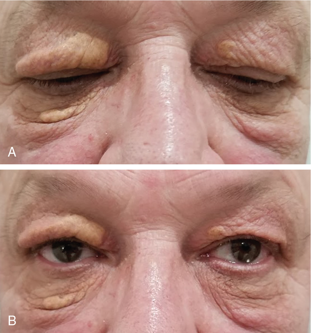 Xanthelasma of bilateral upper and lower eyelids with eyes closed (A) then opened (B).