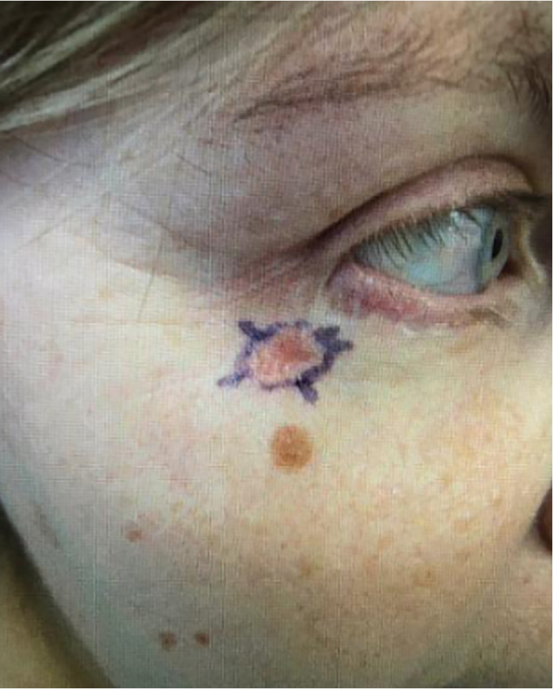 Patient had a basal cell carcinoma (circled in blue) that was present prior to the upper and lower blepharoplasty which had been done by a plastic surgeon. After the procedure, she noticed the spot still was present and would not heal. She was seen in the dermatology clinic by Dr. Levit and a biopsy confirmed the diagnosis of basal cell carcinoma.
