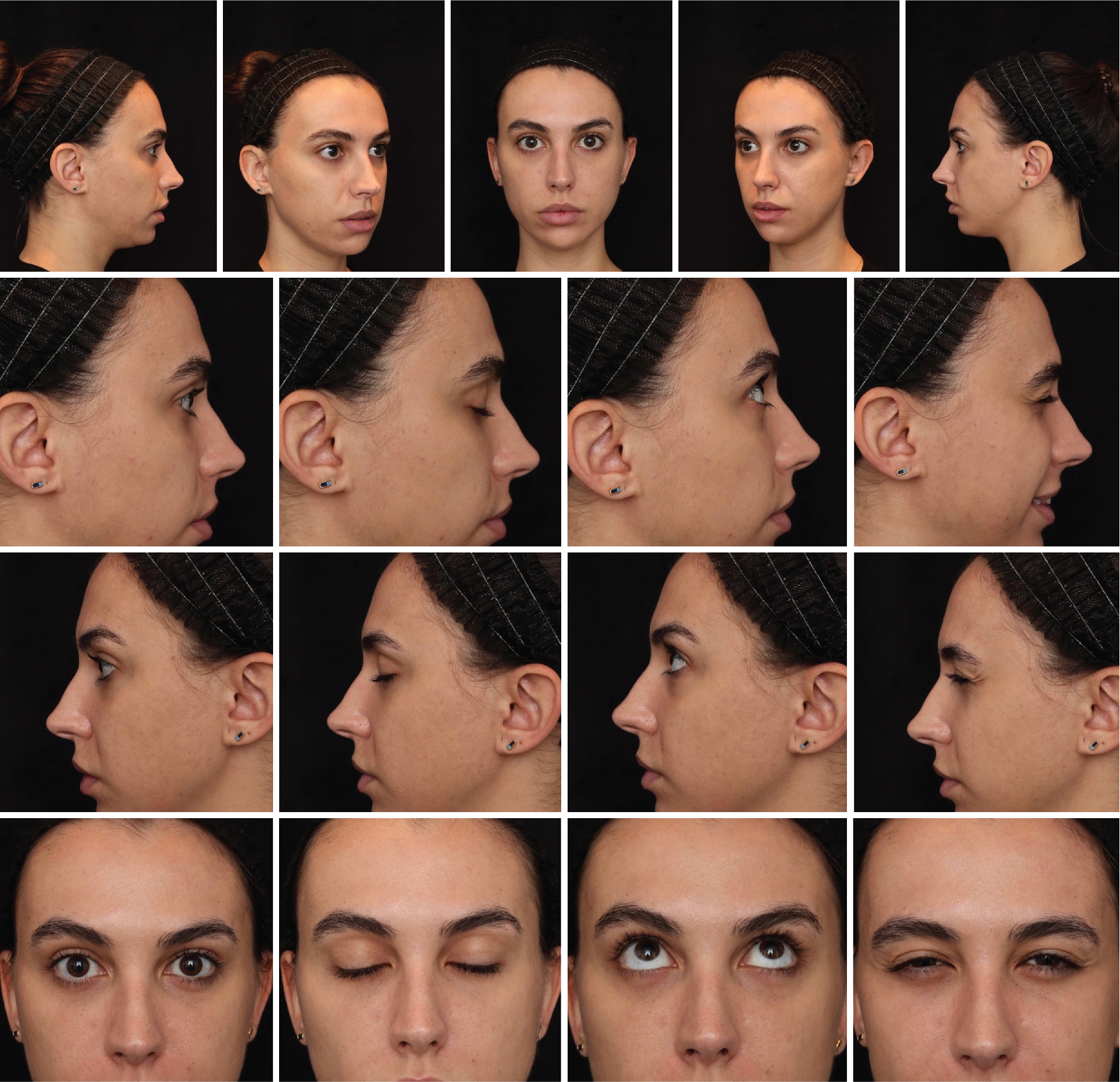 The Blepharoplasty series include the standard Facelift 5-view head series (top row) with additional close-up views (anterior and lateral) showing the eyes in primary gaze, closed, looking up and squinting.