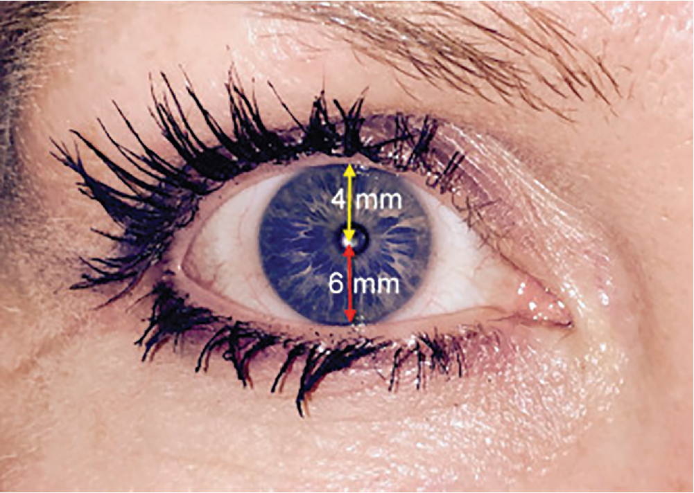 Marginal Reflex Distance (MRD) 1 (Yellow Arrow) and MRD 2 (Red Arrow).