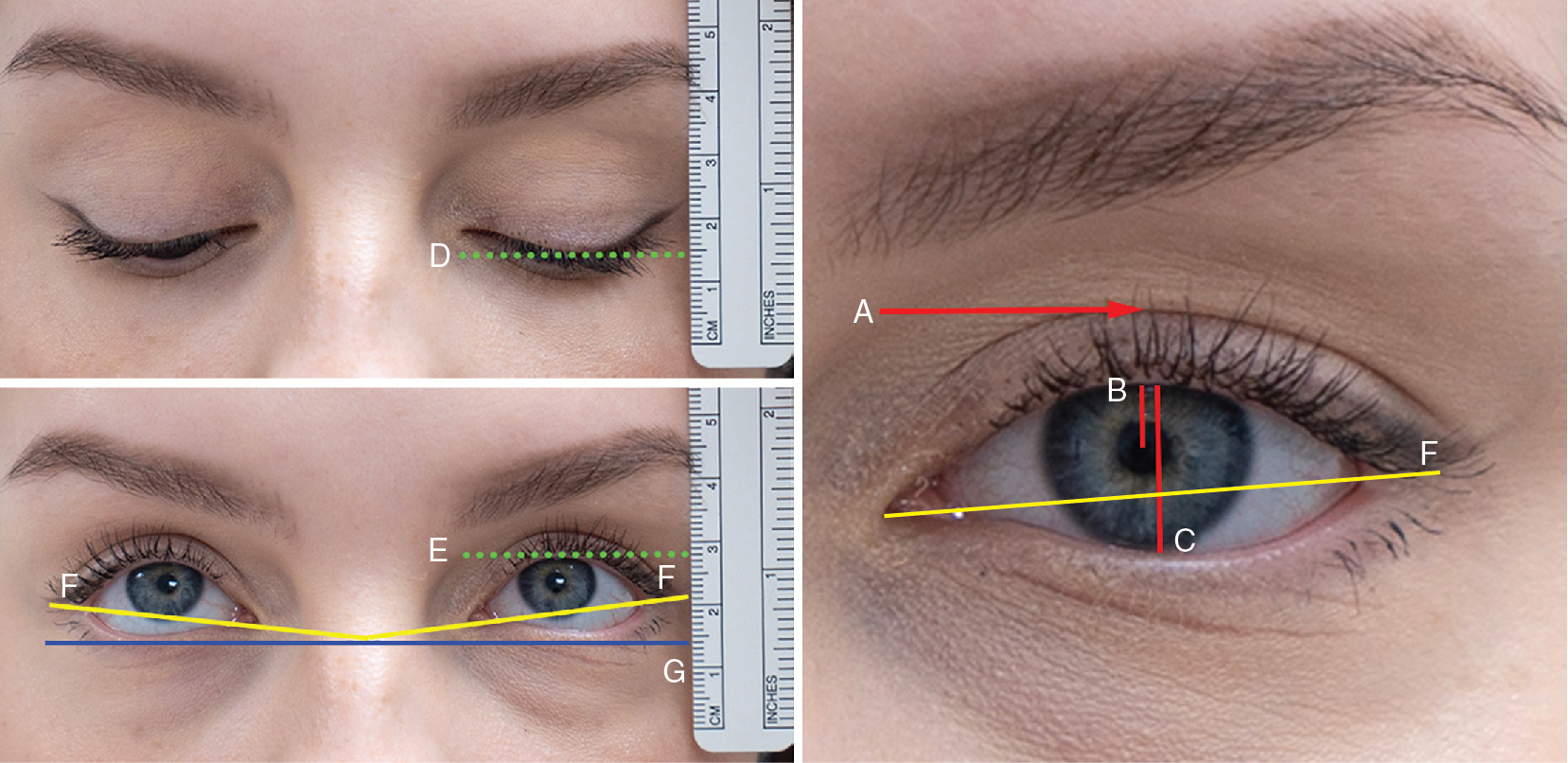 Measurement of eyelid excursion, canthal tilt and marginal reflex distance (MRD-1). The top left image shows the margin of the closed eyelid at the level of 14 mm (line D: a horizontal line at the level of the upper eyelid on downgaze). When the eyelids are fully elevated (bottom left, line E: horizontal line at the level of the upper eyelid on upgaze) the distance between the eyelid margins increases to 28 mm giving a normal eyelid excursion of 14 mm (normal excursion ranges 13-18 mm). Line F (yellow line) the straight line drawn from the lateral to the medial canthi represents the canthal tilt. This image shows the desired positive canthal tilt angle. The right sided image shows a normal eyelid crease (A) upper marginal reflex distance (MRD-1) (B), and palpebral fissure (C). Line G is the horizontal line at the level of the lower eyelids. Canthal tilt- is a measurement of the angle formed by the intersection of line F with G. Eyelid excursion- is the difference between line E- D (should be between 13 and 18 mm).
