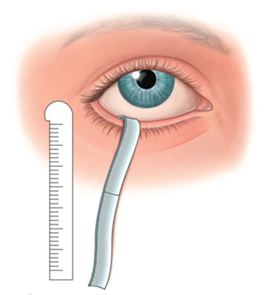 Assesses tear production and help diagnose dry eyes. Tear production is measured by inserting a strip of filter paper towards the lateral eyelid corner over the conjunctiva. The eye is then closed for 5 minutes, after which the filter paper is removed and the wetting distance measured. Normal wetting is 15 mm. Abnormal wetting is less than 10 mm.