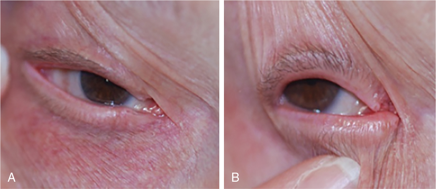 (A) Medial canthal laxity test: used to evaluate involution ectropion. (B) Lateral canthal laxity test: used to evaluate involution ectropion.