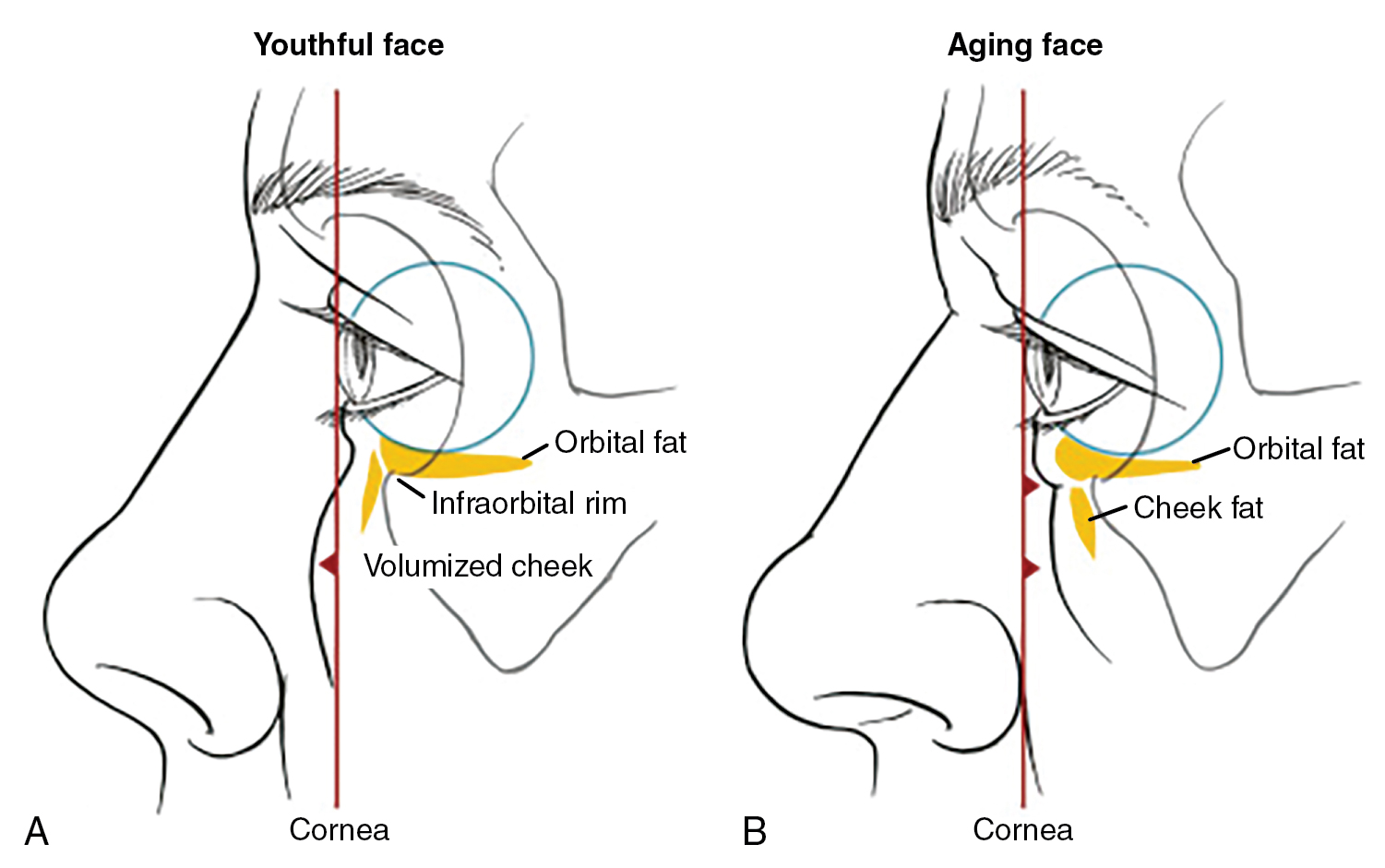 (A) Positive Vector: Using an imaginary line, the globe is anterior to the malar prominence. Generally observed in younger individuals. (B) Negative Vector: Using an imaginary line, the globe is posterior to the malar prominence. Generally observed in elderly individuals.