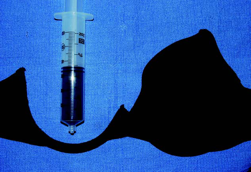 The process begins by fitting the patient with a larger bra that has underwires but minimal padding. This is most often a C cup, although a D cup may be used in some young nulliparous patients and a B cup in some older and more conservative postpartum patients. The chest circumference is variable and generally the same as the patient normally wears (even though many patients do not necessarily wear the correct size bra for their chest circumference).12 Patients are advised that the bra cup material adds volume by itself and that this varies depending on the type of bra. In our sizing bra, the extra volume measured 30 cc per side (Fig. 2). This volume can be added to the final size implant preferred by the patient during