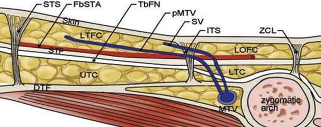 The ligamentous, compartmental, and neurovascular structures in the temporal region. DTF, Deep temporal fascia; FbSTA, Frontal branch of Superficial Temporal Artery; ITS, Inferior temporal septum; LOFC, Lateral orbital fat compartment; LTC, Lower temporal compartment; LTFC, Lateral temporal-cheek fat compartment; MTV, Middle temporal vein; ORL, Orbital retaining ligament; pMTV, Perforator of MTV; STF, Superior temporal fascia; STS, Superior temporal septum; SV, Sentinel vein; pMTV, Perforator of MTV; UTC, Upper temporal compartment; ZCL, Zygomatic cutaneous ligament.
