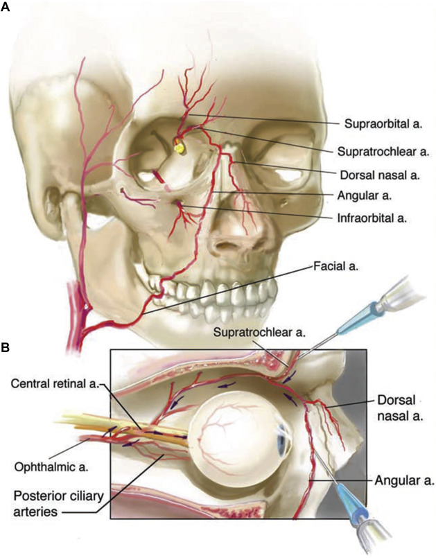 ( A ) The vascular anatomy of the face. ( B ) The mechanism of fat injection inducted blindness. a, artery.