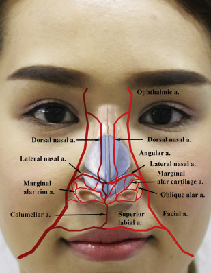 The perinasal vasculature also has anastomosis with the previously mentioned branches from the ophthalmic artery. The facial artery and its terminal branches, such as the angular artery, also share anastomotic arcades with the supratrochlear and infraorbital arteries. Again, the safest location for injection is deep, on the bone or cartilage, or within the dermis. However, it is tempting to inject within the subcutaneous tissue plane, especially within stronger rhytides, such as the nasolabial fold, or to augment nasal shape and projection ( Fig. 3 ). However, the facial artery and its branches course within this region and thus are susceptible to cannulation or embolization, possibly accounting for why perinasal injections are responsible for most complications seen in a recent review. In the worst case scenario, overfilling and the subsequent pressure gradient can lead to even more proximal embolic phenomenon within the internal carotid artery and, therefore, into the central nervous system.