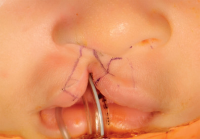A triangular skin flap from the lateral lip just above the white roll is preserved. This is inset into a back cut just above the white roll of the medial lip. It is our experience that this extra tissue is often needed to adequately lengthen the lip and to help prevent secondary scar contracture.