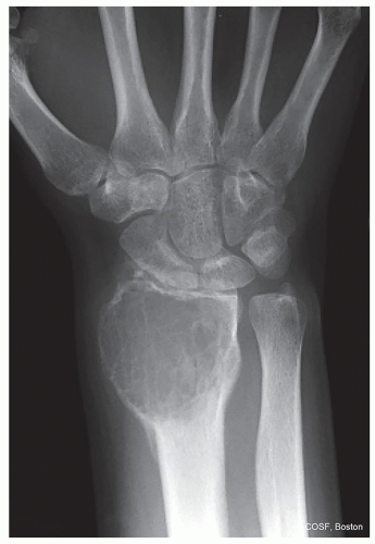 Epiphysis: chondroblastoma in skeletally mature, giant cell tumor in adult (see Figures 41.2 and 41.8)