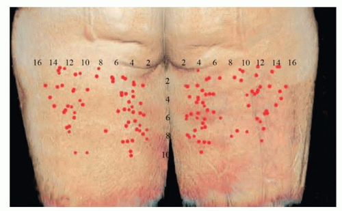 FIG 1 • Posterior thigh perforator location based on CT scanning. Described as location from the gluteal fold and from the midline.