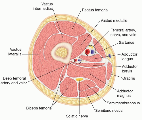 The thigh has three compartments: anterior compartment, medial compartment, and posterior compartment. The medial and posterior compartments are highlighted for profunda artery flap dissection (FIG 2).