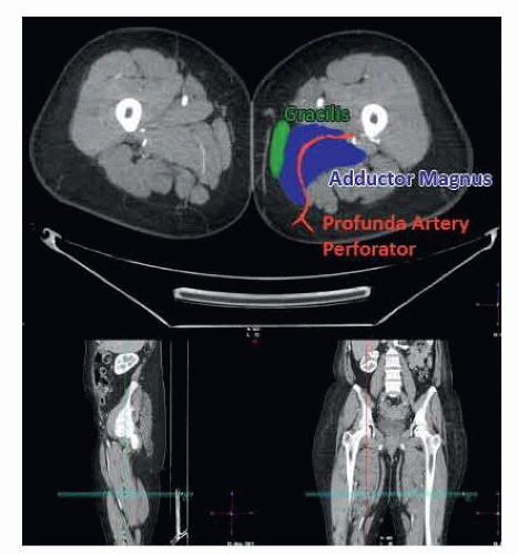 FIG 3 • CTA of the lower extremity identifying the location of the profunda artery perforator behind the gracilis traversing the adductor magnus toward the profunda femoris artery.
