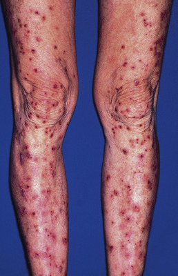 Severe pruritus, with or without prior skin lesions, may be paroxysmal in character with a sudden onset, often severe enough to awaken the patient. It may stop instantly and completely as soon as pain is induced by scratching. However, the pleasure of scratching is so intense that the patient, despite the realization of damaging the skin, is often unable to stop short of inflicting such damage ( Fig. 4.1 ). Itching of this distinctive type is characteristic of a select group of dermatoses: lichen simplex chronicus, atopic dermatitis, nummular eczema, dermatitis herpetiformis, neurotic excoriations, eosinophilic folliculitis, uremic pruritus, prurigo simplex, paraneoplastic itch (usually secondary to lymphoma), and prurigo nodularis. In general, only these disorders produce such intense pruritus and scratching as to induce bleeding. In individual cases, other diseases may manifest such severe symptoms.
