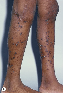 The mechanism of pruritus associated with CKD is multifactorial. Xerosis, secondary hyperparathyroidism, increased serum histamine levels, hypervitaminosis A, iron deficiency anemia, and neuropathy have been implicated. Complications such as acquired perforating disease, lichen simplex chronicus, and prurigo nodularis may develop and contribute to the degree and severity of pruritus ( Fig. 4.2 ).