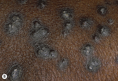 Prurigo simplex is characterized by the lesion known as the prurigo papule, which is dome shaped and topped with a small vesicle. The vesicle is usually present only transiently because of its immediate removal by scratching, so that a crusted papule is more frequently seen. Prurigo papules are present in various stages of development and are seen mostly in middle-age or elderly persons of both genders. The trunk and extensor surfaces of the extremities are common sites, symmetrically distributed. Other areas include the face, neck, lower trunk, and buttocks. The lesions usually appear in crops, so that papulovesicles and the late stages of scarring may be seen at the same time. At times eczematous morphology may be intermixed.