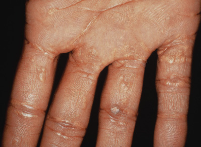 Primary biliary cirrhosis occurs almost exclusively in women older than 30. Itching may begin insidiously and may be the presenting symptom in a quarter to half of patients. With time, extreme pruritus develops in almost 80% of patients. This almost intolerable itching is accompanied by jaundice and a striking melanotic hyperpigmentation of the entire skin; the patient may turn almost black, except for a hypopigmented “butterfly” area in the upper back. Eruptive xanthomas, planar xanthomas of the palms ( Fig. 4.3 ), xanthelasma, and tuberous xanthomas over the joints may be seen.