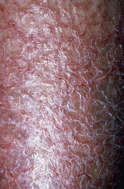 Asteatotic eczema, eczema craquelé, and xerotic eczema are other names for this pruritic condition. Winter itch is characterized by pruritus that usually first manifests and is most severe on the legs and arms. Extension to the body is common; however, the face, scalp, groin, axillae, palms, and soles are spared. The skin is dry with fine flakes ( Fig. 4.4 ). The pretibial regions are particularly susceptible and may develop eczema craquelé, exhibiting fine cracks in the eczematous area that resemble the cracks in old porcelain dishes.