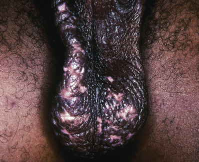 The scrotum of an adult is a susceptible site for circumscribed neurodermatitis (lichen simplex chronicus) ( Fig. 4.5 ). Psychogenic pruritus is probably the most frequent type of itching seen. Why it preferentially affects the scrotum, or in women the vulva (see pruritus vulvae ), is unclear. Lichenification may result, can be extreme, and may persist for many years despite intensive therapy.