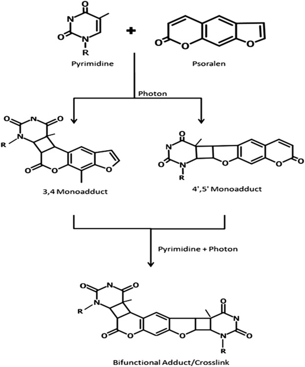 Following oral ingestion or topical application, the psoralen intercalates between DNA base pairs but remains quiescent in the absence of ultraviolet radiation. Upon initial exposure to UV-A, cyclobutane monoadducts are formed with pyrimidine bases. When a second photon of energy is absorbed, psoralen-DNA cross-linking occurs, which inhibits DNA replication and causes cell cycle arrest ( Fig. 3.1 ).