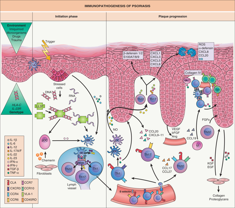The underlying pathophysiology involves various classes of T cells and their interactions with dendritic cells and cells involved in innate immunity, including neutrophils and keratinocytes