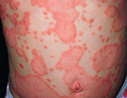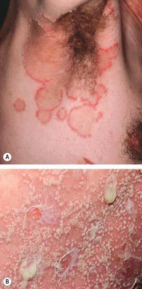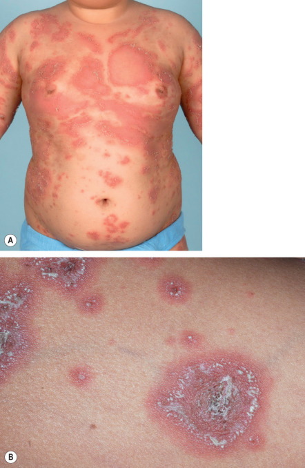 A,B Multiple annular inflammatory plaques whose active borders are studded with pustules followed by desquamation. As these lesions enlarge, there is central clearing. The intensity of erythema can vary and the color is influenced by the skin phototype.