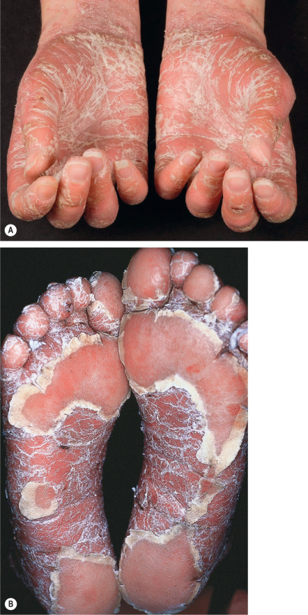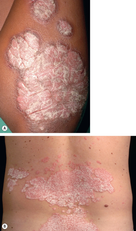 In chronic plaque psoriasis, there is a relatively symmetric distribution of sharply defined, erythematous, scaly plaques ( Figs 8.3 & 8.4 ). The degree of body surface area involvement can vary, from limited to extensive. The scalp, elbows, knees and lumbosacral area are sites of predilection, as are the hands and feet ( Fig. 8.5 ). The genitalia are involved in up to 45% of patients ( Fig. 8.6 ; see Ch. 73 ). Plaques may persist for months to years at the same locations. Although the course of this disease is chronic, periods of complete remission do occur and remissions of 5 years have been reported in ~15% of patients.