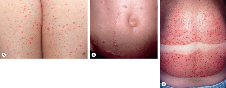 Guttate psoriasis is more commonly seen in children and adolescents and is frequently preceded by an upper respiratory tract infection ( Fig. 8.7 ). In over half of the patients, an elevated antistreptolysin O, anti-DNase B or streptozyme titer is found, indicating a recent streptococcal infection (see previous section).