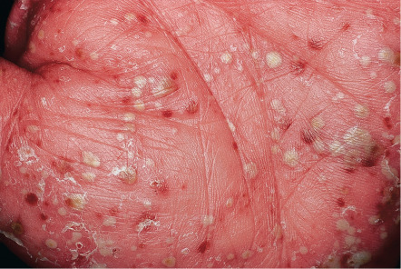 Annular pattern . The eruption is characterized by annular lesions, consisting of erythema and scaling with pustulation at the advancing edge ( Fig. 8.9 ). The lesions enlarge by centrifugal expansion over a period of hours to days, while healing occurs centrally.