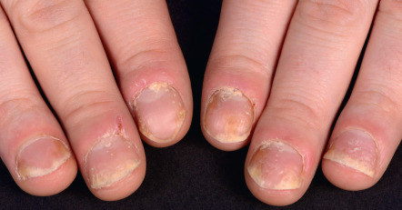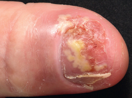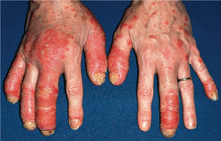 This is a rare manifestation of psoriasis. Clinically, pustules are seen on the distal portions of the fingers ( Fig. 8.11 ) and sometimes the toes. Pustulation is often followed by scaling and crust formation. Pustules may also form in the nail bed (beneath the nail plate), and there may be shedding of nail plates. Transition into other forms of psoriasis can occur and acrodermatitis continua may be accompanied by annulus migrans of the tongue (see below).