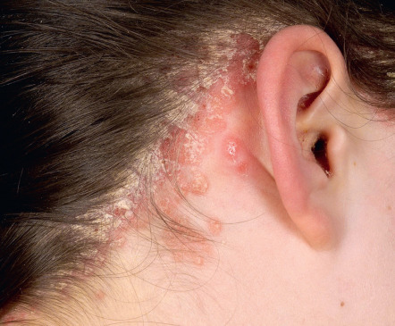Seborrheic dermatitis is characterized by pink to red patches with yellowish, sometimes greasy, scales (see Ch. 13 ). The sites of predilection are the scalp, central face, ears, presternal area, and intertriginous zones. As the clinical features of psoriasis and seborrheic dermatitis can be seen in the same patient, some authors use the term “sebopsoriasis”, especially when diagnostic lesions of psoriasis are not present elsewhere.