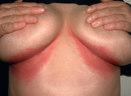 Flexural lesions are characterized by shiny, pink to red, sharply demarcated thin plaques ( Fig. 8.13 ). There is much less scale than in untreated chronic plaque psoriasis. Often a central fissure is seen. The most common sites of involvement are the retroauricular fold, intergluteal cleft, inguinal crease, axilla, and inframammary region. When flexural areas are the only sites of involvement, the term “inverse” psoriasis is sometimes used. Localized dermatophyte, candidal or bacterial infections can be a trigger for flexural psoriasis.