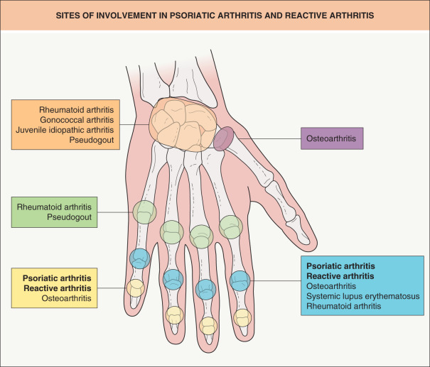 In one study involving 1511 patients with chronic plaque psoriasis, ~20% of the affected individuals had psoriatic arthritis . DIP involvement was observed in ~40% of the patients with arthritis, and 5% suffered from arthritis mutilans . Patients with psoriatic arthritis can have involvement of juxta-articular tendons (tendonitis) and the sites where they insert into bone (enthesitis) as well as swelling of the fingers (dactylitis). Enthesitis and dactylitis have been reported in ~20% and 15–30%, respectively, of patients with “probable” or definite psoriatic arthritis. In patients with psoriasis, nail involvement is a strong predictor of concomitant psoriatic arthritis .
