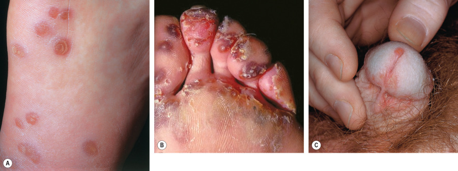This syndrome features urethritis, arthritis, ocular findings and oral ulcers, in addition to psoriasiform skin lesions. The disorder is uncommon in children and occurs more frequently in men than in women. The urethritis may be mild or severe and accompanied by complications such as cystitis, cervicitis, and salpingitis. Chlamydia trachomatis is a major cause of urethritis and may trigger the entire syndrome, as may other infections such as shigellosis. Conjunctivitis is a common eye finding in affected patients, although iritis, uveitis with glaucoma, and keratitis may also occur. Polyarthritis and sacroiliitis are the most frequent joint manifestations. Cutaneous lesions occur in approximately 5% of reactive arthritis patients, with a predilection for the soles, extensor surfaces of the legs, penis, dorsal aspects of the hands, fingers, nails, and scalp ( Fig. 8.17 ). The lesions on the plantar surface usually have thick yellow scale and are often pustular (keratoderma blennorrhagicum). Psoriatic plaques on the penis are referred to as balanitis circinata.