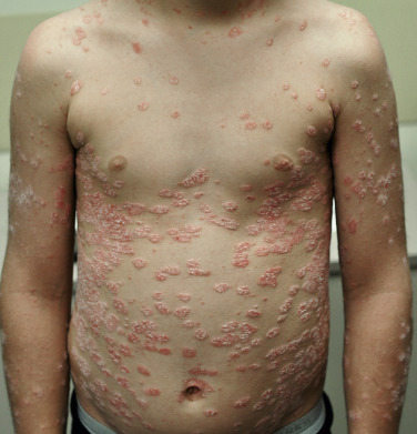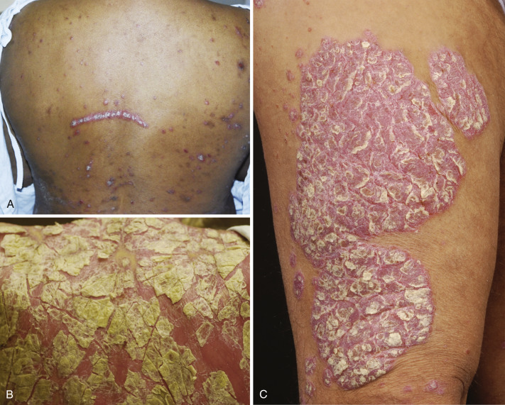 Guttate psoriasis is a common form of psoriasis during childhood and early adolescence that classically arises concomitant with and shortly after streptococcal throat infection. It is characterized by eruption of small scaly plaques and papules, 5 to 10 mm in size, over the trunk and proximal extremities ( Fig. 6-2 ). These eruptions are usually self-limited and resolve over 3 to 4 months. About a third of patients may develop repeated episodes of guttate psoriasis and about a third go on to develop chronic plaque psoriasis. This subtype of psoriasis has the strongest association with HLA-Cw6. Patients with chronic plaque psoriasis may experience guttate flares following streptococcal throat infections.