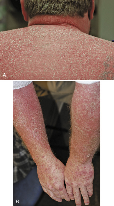 Erythrodermic psoriasis is a severe form that involves most if not all of the skin surface. Diffuse erythema is the most prominent sign, and in contrast to the thick adherent scale seen in chronic plaque psoriasis, erythrodermic psoriasis is characterized by fine delicate scale that easily flakes off ( Fig. 6-3 ). Patients with this form of psoriasis generally feel unwell. They have difficulties maintaining thermoregulation, and are often hypohidrotic due to occlusion of the sweat ducts. High-output cardiac failure may occur given the increased blood flow to the skin surface.