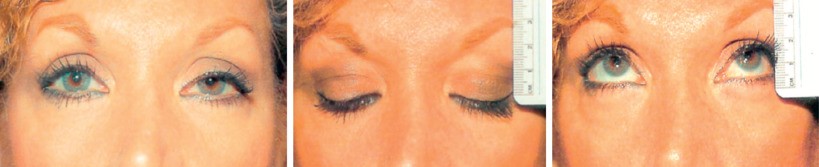 • Levator function: Levator muscle function is the most important factor in determining the specific surgical intervention for eyelid ptosis. Excursion of the levator muscle is the measured movement of the eyelid margin from extreme upward to extreme downward gaze ( Fig. 3.7.3 ). To isolate the levator, decrease the input from the frontalis muscle by splinting the eyebrow against the forehead with your thumb. A measurement greater than 10 mm is characterized as good, 5 to 10 mm as moderate, and less than 5 mm as poor.