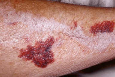 Ecchymoses are usually round or oval macules. In actinic purpura, they are characteristically confined to the dorsa of the hands and forearms. The skin itself in these areas may also be more fragile and may tear easily ( Fig. 17.2 ).