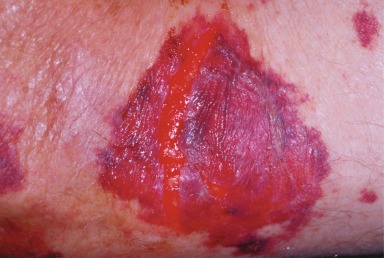 The word purpura is derived from the Latin word for “purple,” a clinical characteristic that helps to differentiate the lesion from erythema, which is red. Blanchability is the clinical sign that best distinguishes the two. Purpura is nonblanchable because the blood is extravasated outside the vessel walls.