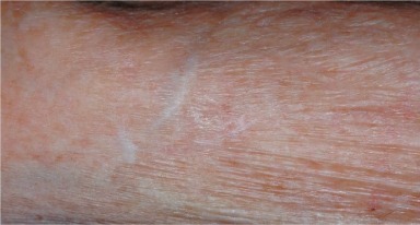 Another clinical finding is the development of stellate pseudoscars ( Fig. 17.3 ). These thin line scars result from the healing of the skin tears.