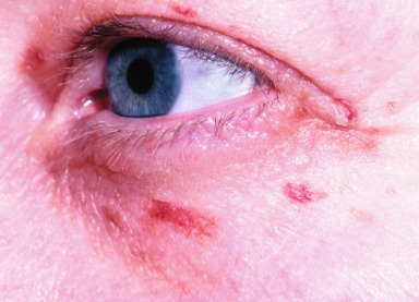 In patients with amyloidosis, the amyloid may infiltrate the skin and result in papules and nodules, which are most often present on the face, particularly the eyelids. These characteristically bleed easily. Purpura also occurs in the absence of papules and can be precipitated by minor trauma or the Valsalva maneuver, referred to as “pinch” purpura ( Fig. 17.4 ). The tongue may also be enlarged.