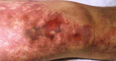 Disseminated intravascular coagulation is a condition in which uncontrolled clotting results in diffuse thrombus formation. The skin is frequently affected, with thrombosed vessels causing skin necrosis. Hemorrhage from these vessels appears as ecchymoses ( Fig. 17.6 ). Petechiae also occur as a result of the thrombocytopenia from platelet consumption. Purpura fulminans can be confused with the term DIC. Purpura fulminans is the cutaneous marker of DIC, characterized by the sudden appearance of ecchymosis, symmetrically distributed mainly on the extremities. Skin necrosis often develops in purpura fulminans in the setting of DIC and is most commonly associated with an infection ( Fig. 17.7 ).